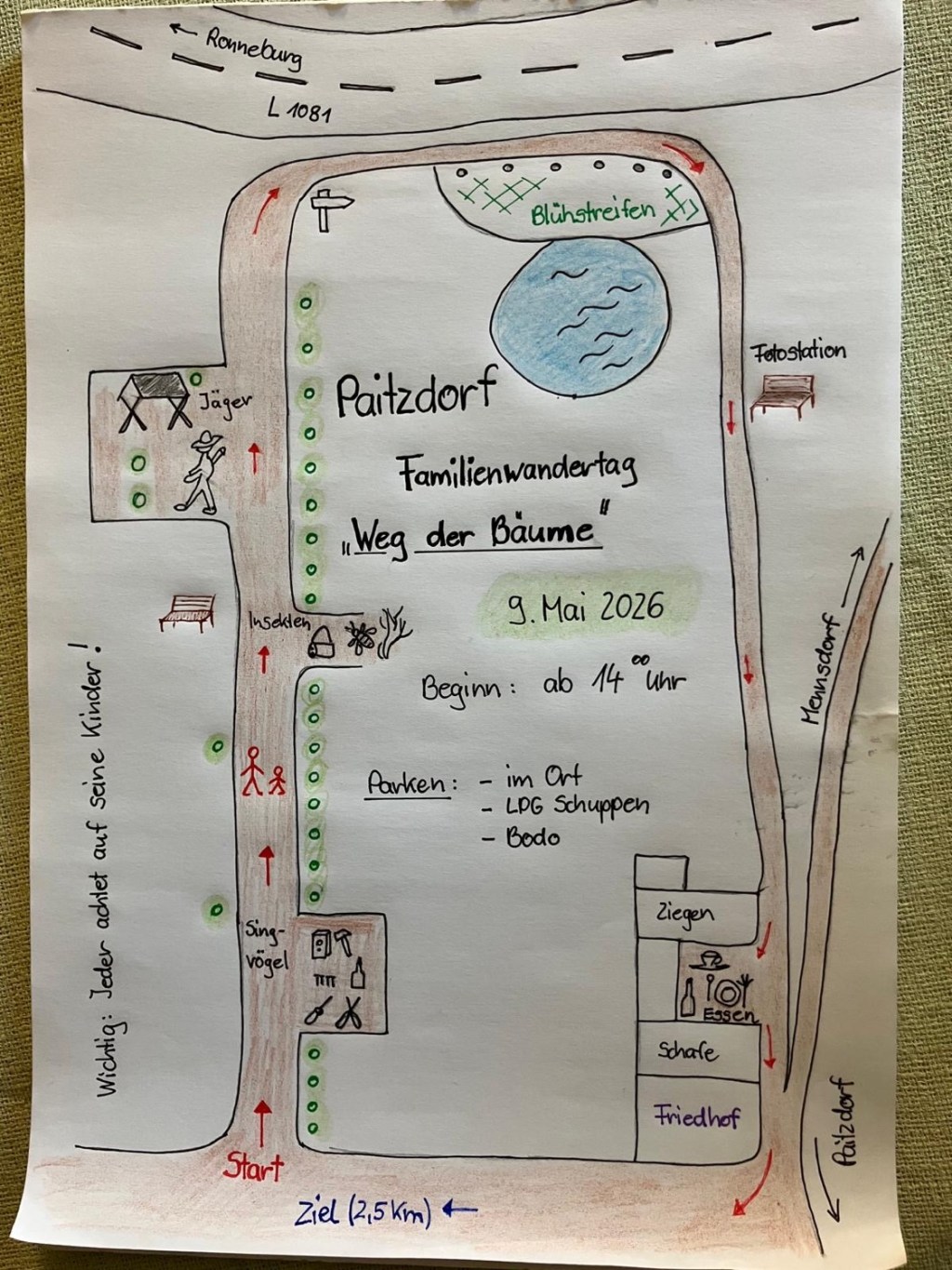 Am 9.5.26 ab 14:00 veranstalten wir einen Familienwandertag mit verschiedenen Stationen. Seid herzlich willkommen und teilt gern den Termin in eurem Freundeskreis. Alle wichtigen Infos findet ihr auf der Karte.